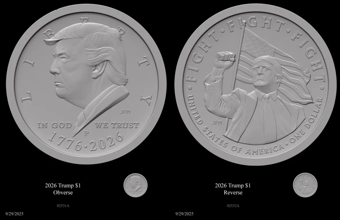 Beach shared images on X showing drafts for a potential $1 coin with images of President Donald Trump on both sides.