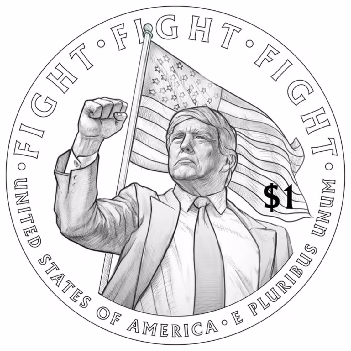 The message showed the front and back of a coin with a profile of Trumps head on both sides and the words FIGHT, FIGHT, FIGHT, a reference to the words Trump yelled to the crowd after a 2024 assassination attempt, also on one of the sides.