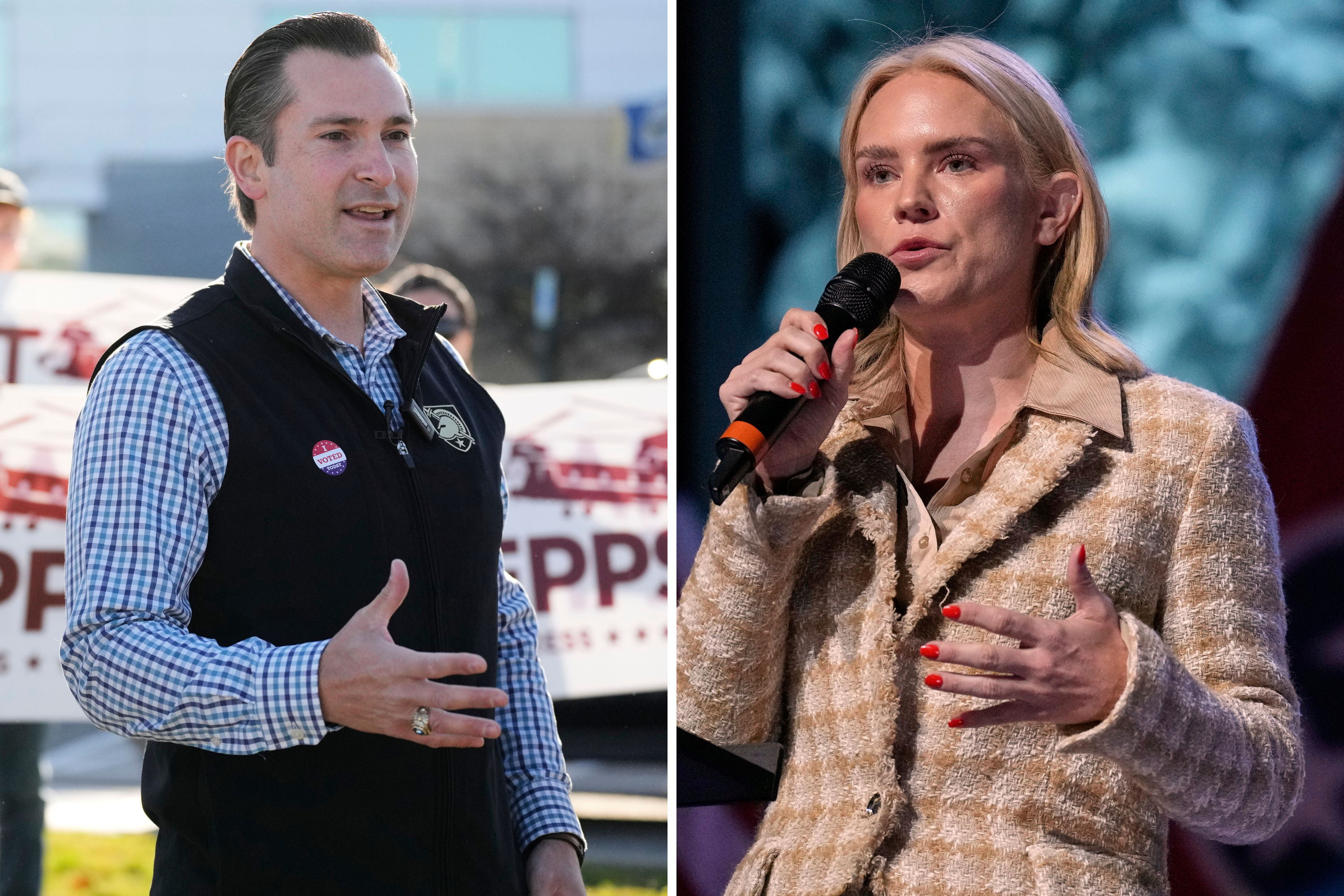 Left: Republican candidate Matt Van Epps and Democratic candidate Aftyn Behn speaking in November at respective campaign events in the special election for the seventh congressional district in Nashville, Tennessee. (Associated Press/George Walker IV)