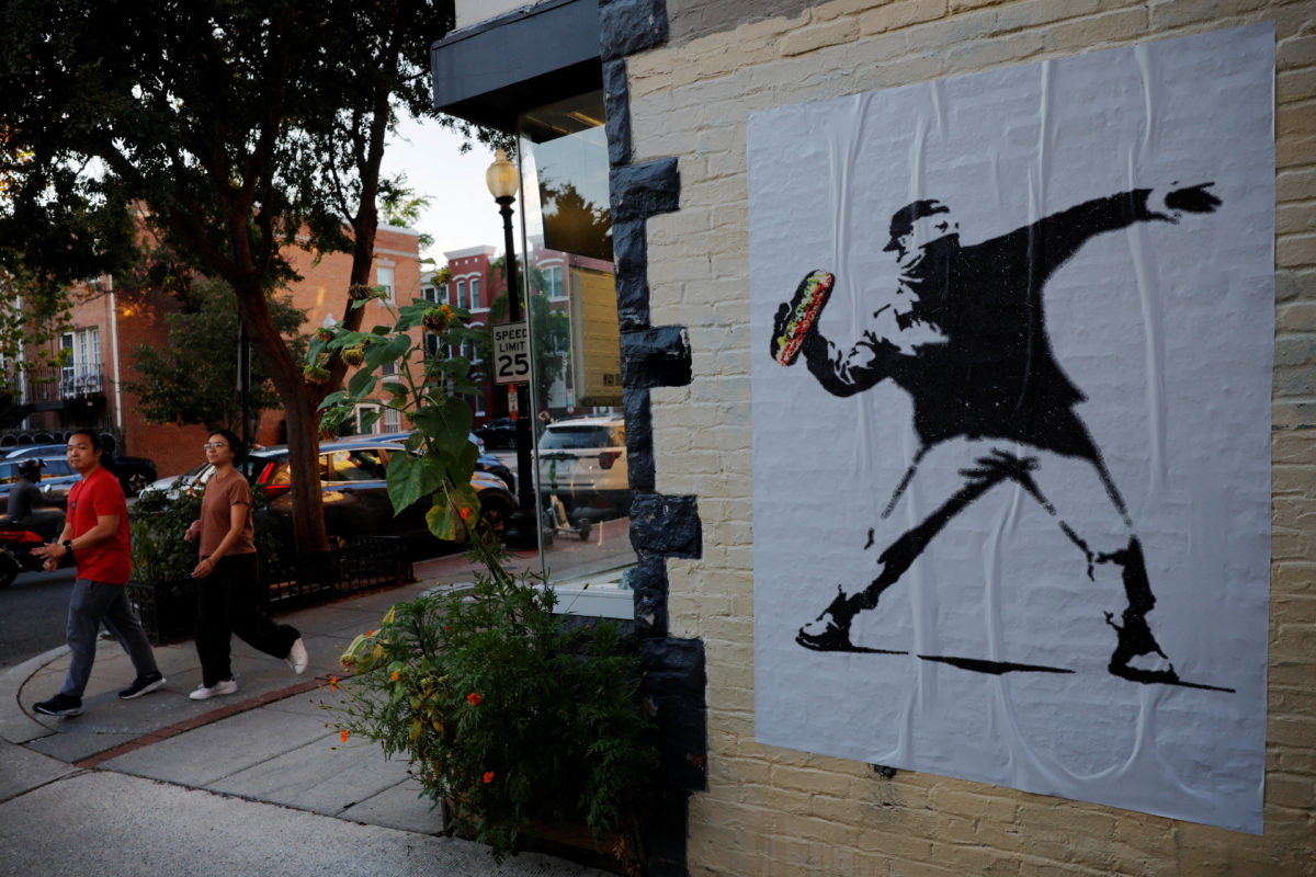 Pedestrians in Washington, D.C., pass a sign depicting a man throwing a sandwich, used as a symbol of protest, after President Donald Trump deployed the National Guard and ordered an increased presence of federal law enforcement to assist in crime prevention over the summer. Photo by Brian Snyder/Reuters