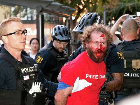 A Kirk supporter that was selling merchandise at the site of a Turning Point USA event is led off by police after he was involved in a fight with a Kirk counter protestor who was also arrested at UC Berkeleys Sproul Plaza, in Berkeley, Calif., on Monday, Nov. 10, 2025 (Andres Jimenez Larios/Bay City News)