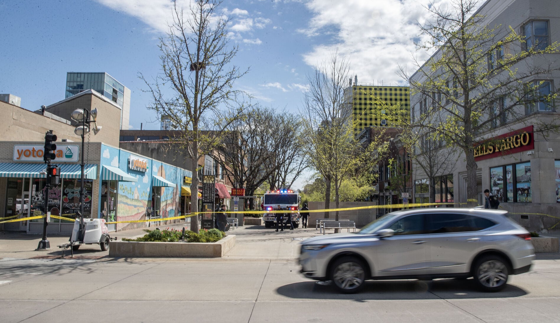 Cars drive past the closed off entrance of the Pedestrian Mall in Iowa City, Iowa on Sunday, April 19, 2026. A shooting in the 100 block of East College Street occurred early Sunday morning, which resulted in several University of Iowa students being sent to the hospital. Police are still investigating the area and no arrests have been made at this time.