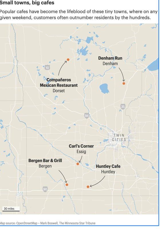 The restaurant is one of those rural Minnesotan eateries with a peculiar distinction: They draw in far more customers than their tiny towns have residents. These cafes and bar-and-grills arent just businesses, but the beating hearts of their communities, in some cases keeping their towns on the map.