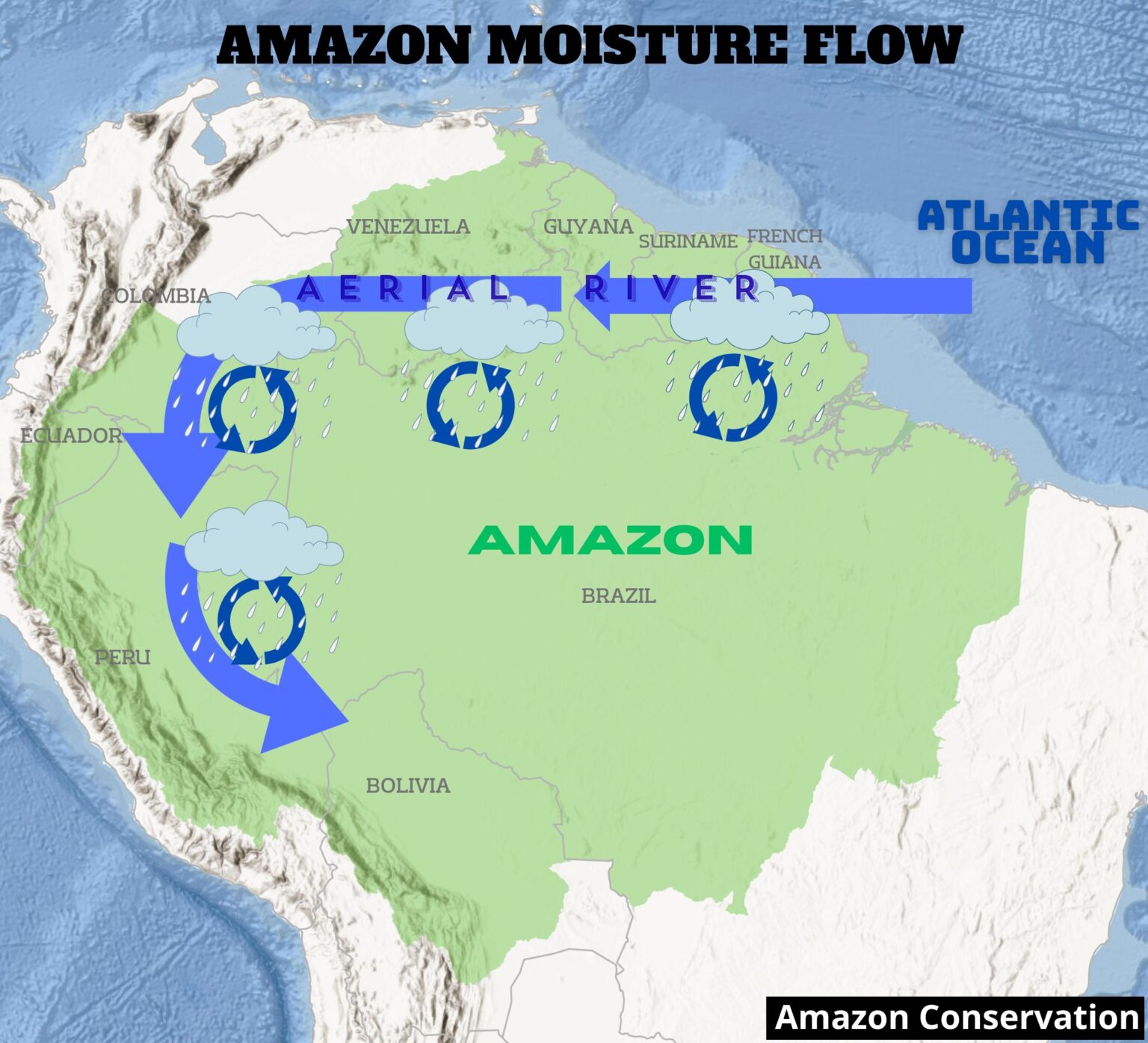 flying rivers, has emerged as an essential concept related to the conservation of the Amazon. In short, moisture flows from the Atlantic Ocean across the Amazon, uniquely facilitated by the rainforest itself. As they move westward, these flying rivers drop water onto the forest below. The forest subsequently transpires moisture back into them, thus
