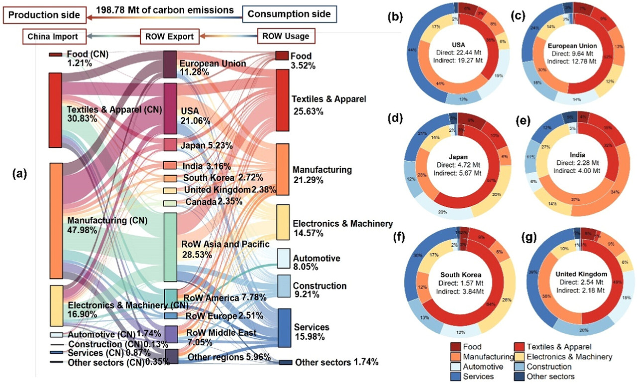Figure 4. Carbon footprint linked to embedded plastic exported from China in 2022. (a) Global value-chain of carbon footprint (GHG emissions). (bg) Top 6 countries and regions with the highest carbon footprint. The inner ring represents the sectoral proportion of direct consumption, while the outer ring represents the sectoral proportion of indirect consumption.