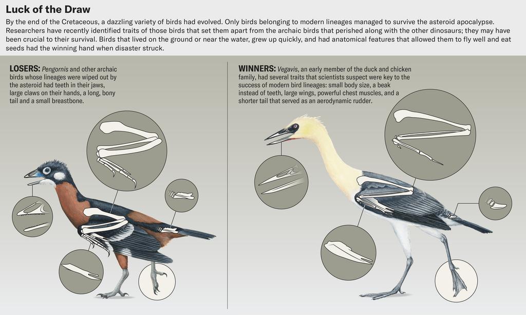 Recently an answer has emerged, based on new research into fossils, genetics and ecology. Many birds were flying over the heads of T. rex and Triceratops when the asteroid hit, and most died alongside their dinosaur cousins. The only birds to make it out of the Cretaceous were modern-style species. Their survival came down to circumstance: where they happened to live and the features they happened to possess served them in good stead when the world went to hell.